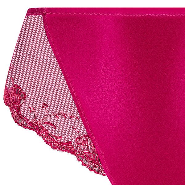 安心、快適な深めショーツ。気になるお腹が隠れます。シルクサテン地と、モチーフの際立つチュール地の組み合わせ。