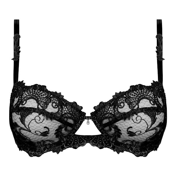 ワイヤー入りのパッドなし3/4カップブラ。ナチュラルな着心地で、丸みのある水平な縁取りのデコルテがとてもフェミニン。繊細なレースに、モチーフが際立つカップ。シンプルな肩紐にレースモチーフの飾り。中央にはスワロフスキー。画像はBカップ。D,E,Fカップは補強のためデザインが異なります。
