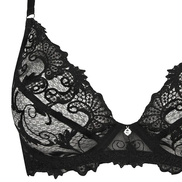 ワイヤー入りのパッドなしハーフカップブラ。繊細なギピュールレースのモチーフが際立つカップ。アンダーベルトにゴールドのリング飾り。中央にはスワロフスキー。画像はBカップ。B,Cカップ共通デザイン。Dカップはアンダーベルトに補強の裏地付き。