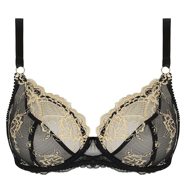 ワイヤー入りのパッドなしブラ。3つのパーツを合わせたカップ。アンダーベルトは補強のチュール裏地付き。商品画像はDカップ。
