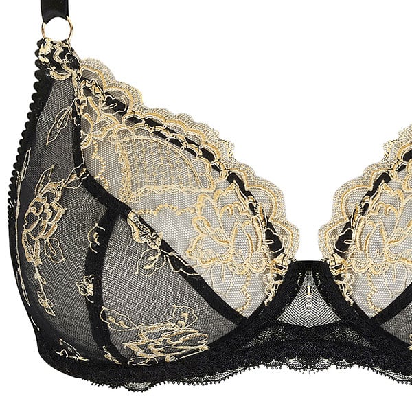 ワイヤー入りのパッドなしブラ。3つのパーツを合わせたカップ。アンダーベルトは補強のチュール裏地付き。商品画像はDカップ。