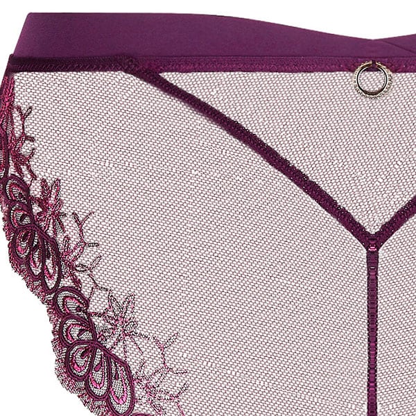 プラムとブラックカラントの柔らかな色合い。 2つの異なる糸からなるイタリア製のマルチスレッド刺しゅうは、透明度の高いプラムカラーのチュールに 浮き彫りの形で施され、軽やかさと極上の繊細さが表現されています。グラフィック化された葉の刺しゅうには光沢感のある糸を用い、マットなコード刺しゅうとのコントラストを生んでいます。ランジェリーにはイタリア製のシルクサテンを用い、しなやかさと柔らかさが快適な着心地をもたらします。 シルエットのエレガンスとクラフトマンシップへの情熱が融合した、魅惑的な色彩の世界へとあなたを誘います。