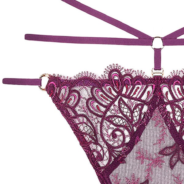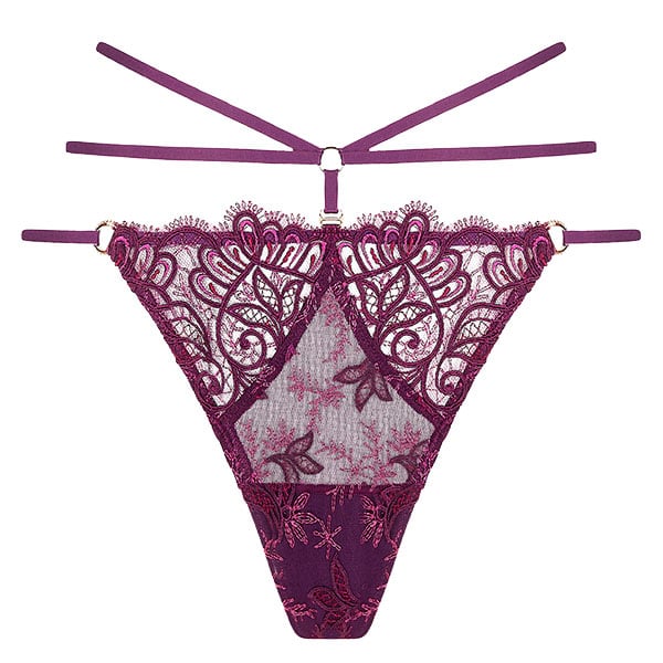 プラムとブラックカラントの柔らかな色合い。 2つの異なる糸からなるイタリア製のマルチスレッド刺しゅうは、透明度の高いプラムカラーのチュールに 浮き彫りの形で施され、軽やかさと極上の繊細さが表現されています。グラフィック化された葉の刺しゅうには光沢感のある糸を用い、マットなコード刺しゅうとのコントラストを生んでいます。ランジェリーにはイタリア製のシルクサテンを用い、しなやかさと柔らかさが快適な着心地をもたらします。 シルエットのエレガンスとクラフトマンシップへの情熱が融合した、魅惑的な色彩の世界へとあなたを誘います。