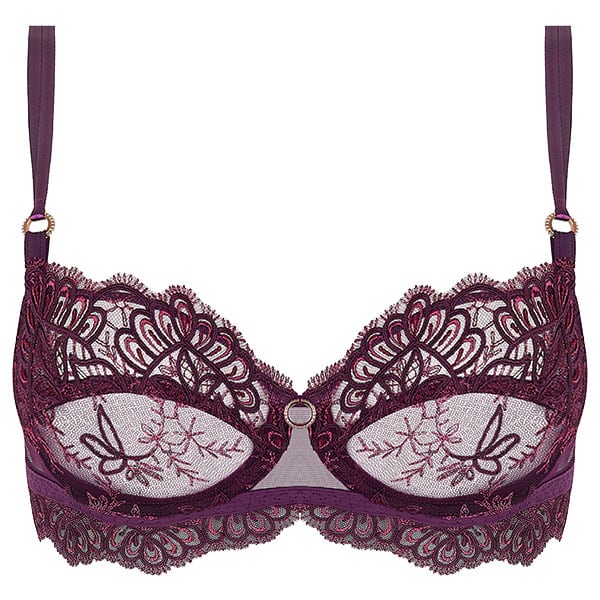プラムとブラックカラントの柔らかな色合い。 2つの異なる糸からなるイタリア製のマルチスレッド刺しゅうは、透明度の高いプラムカラーのチュールに 浮き彫りの形で施され、軽やかさと極上の繊細さが表現されています。グラフィック化された葉の刺しゅうには光沢感のある糸を用い、マットなコード刺しゅうとのコントラストを生んでいます。ランジェリーにはイタリア製のシルクサテンを用い、しなやかさと柔らかさが快適な着心地をもたらします。 シルエットのエレガンスとクラフトマンシップへの情熱が融合した、魅惑的な色彩の世界へとあなたを誘います。