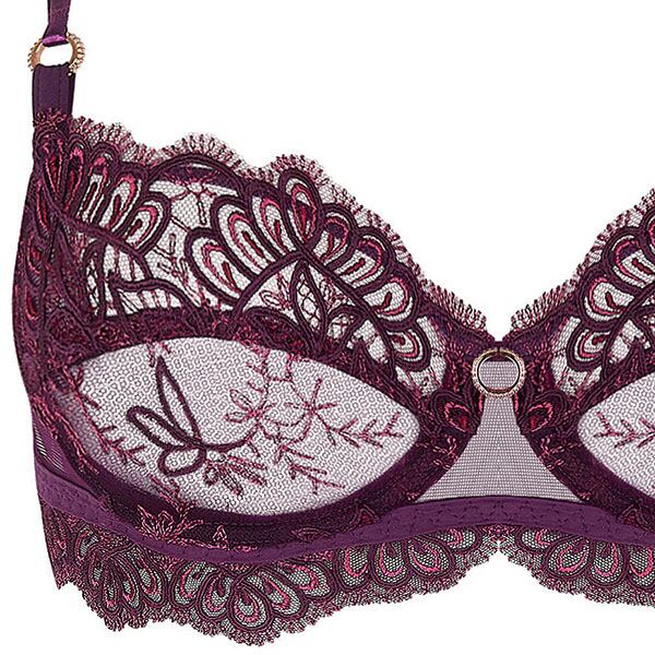 プラムとブラックカラントの柔らかな色合い。 2つの異なる糸からなるイタリア製のマルチスレッド刺しゅうは、透明度の高いプラムカラーのチュールに 浮き彫りの形で施され、軽やかさと極上の繊細さが表現されています。グラフィック化された葉の刺しゅうには光沢感のある糸を用い、マットなコード刺しゅうとのコントラストを生んでいます。ランジェリーにはイタリア製のシルクサテンを用い、しなやかさと柔らかさが快適な着心地をもたらします。 シルエットのエレガンスとクラフトマンシップへの情熱が融合した、魅惑的な色彩の世界へとあなたを誘います。