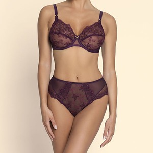 プラムとブラックカラントの柔らかな色合い。 2つの異なる糸からなるイタリア製のマルチスレッド刺しゅうは、透明度の高いプラムカラーのチュールに 浮き彫りの形で施され、軽やかさと極上の繊細さが表現されています。グラフィック化された葉の刺しゅうには光沢感のある糸を用い、マットなコード刺しゅうとのコントラストを生んでいます。ランジェリーにはイタリア製のシルクサテンを用い、しなやかさと柔らかさが快適な着心地をもたらします。 シルエットのエレガンスとクラフトマンシップへの情熱が融合した、魅惑的な色彩の世界へとあなたを誘います。