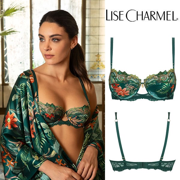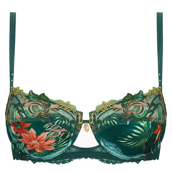 エレガントで独創的、そして極めて個性的でモダンなスタイル。6色の糸を用いたイタリア製高級マルチスレッド刺しゅうで、シクラメンの丸みと葉の波打つような動きを表現。ブラジャーのアンダー部とボトムには、透かし細工と網目模様の遊びで活気を与える繊細で軽やかなストレッチレース。シルク地とフィット感の良いチュール地には、トロピカルな風景をイタリア風にプリント。高度なインクジェットプリント技術を採用しています。