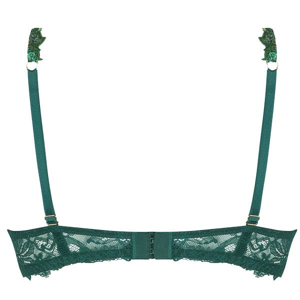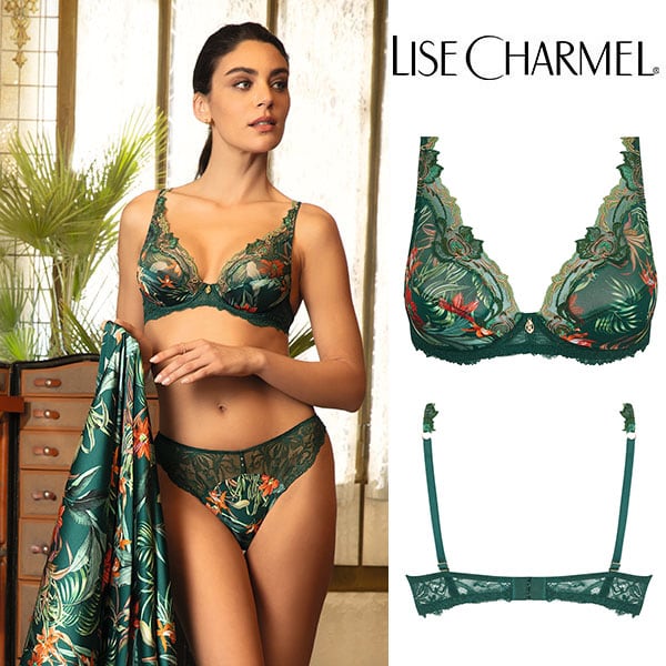 エレガントで独創的、そして極めて個性的でモダンなスタイル。6色の糸を用いたイタリア製高級マルチスレッド刺しゅうで、シクラメンの丸みと葉の波打つような動きを表現。ブラジャーのアンダー部とボトムには、透かし細工と網目模様の遊びで活気を与える繊細で軽やかなストレッチレース。シルク地とフィット感の良いチュール地には、トロピカルな風景をイタリア風にプリント。高度なインクジェットプリント技術を採用しています。