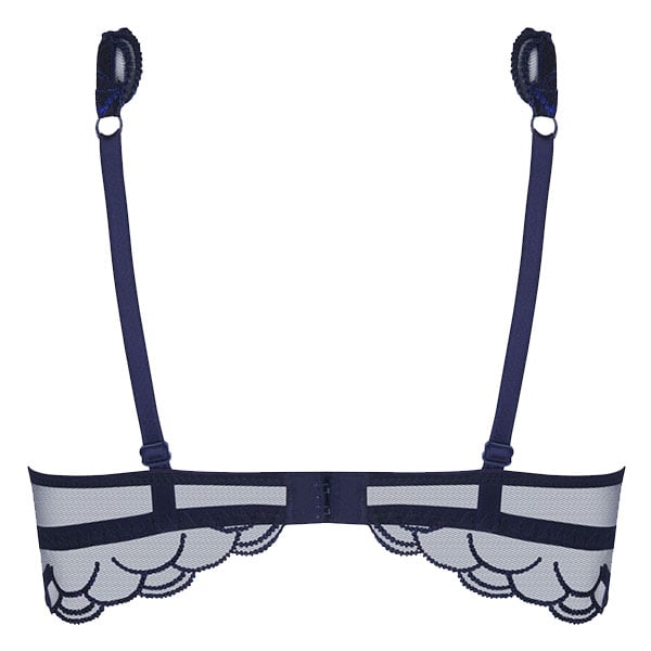 ワイヤー入りのハーフカップレースブラ。深いV字のデコルテ。