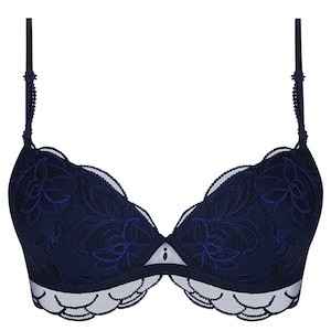 ワイヤー入りのモールドパッドブラ。ふっくら丸みを帯びたシルエットを作ります。付け外しできるネックストラップ。商品画像はBカップ。Eカップのベルトは補強のメッシュ裏地付き。