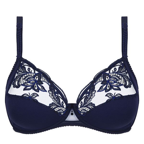 ワイヤー入りのフルカップブラ。脇が3つのパーツで補強されていて、より安定感が増しています。ベルトは補強のメッシュ裏地付き。画像はDカップ。