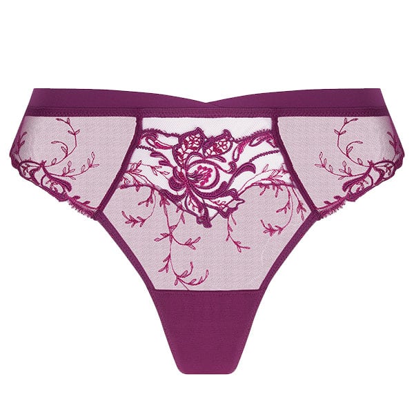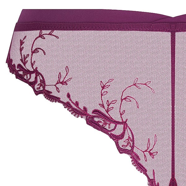 赤い果実の魅力にインスパイアされた鮮やかで明るく深みのある発色が、肌を優しく輝かせ質感に洗練された雰囲気をプラスします。大きなハイビスカスのモチーフが透明感のあるレースの上に官能的に配置され、優雅に彩ります。