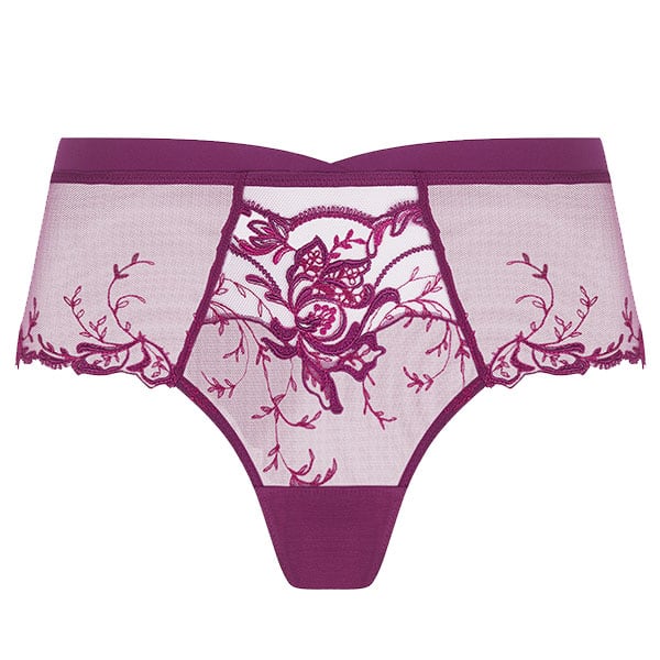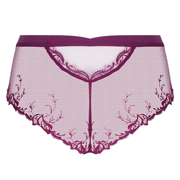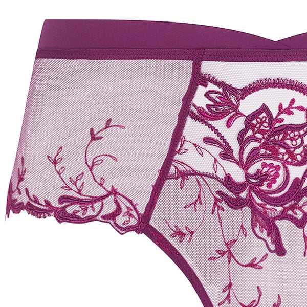 赤い果実の魅力にインスパイアされた鮮やかで明るく深みのある発色が、肌を優しく輝かせ質感に洗練された雰囲気をプラスします。大きなハイビスカスのモチーフが透明感のあるレースの上に官能的に配置され、優雅に彩ります。