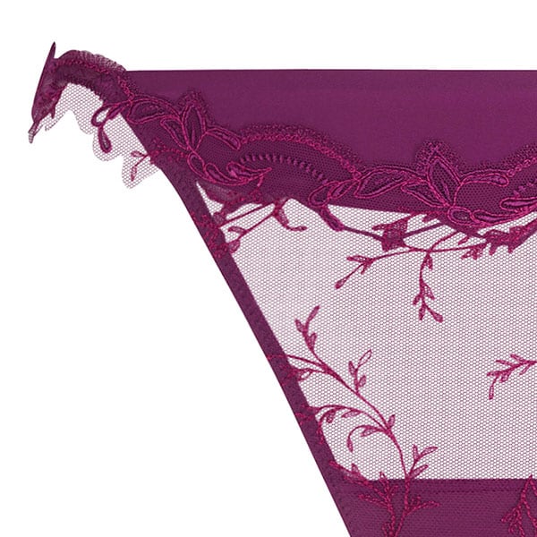 赤い果実の魅力にインスパイアされた鮮やかで明るく深みのある発色が、肌を優しく輝かせ質感に洗練された雰囲気をプラスします。大きなハイビスカスのモチーフが透明感のあるレースの上に官能的に配置され、優雅に彩ります。