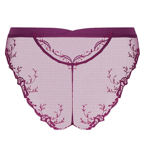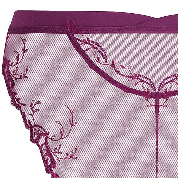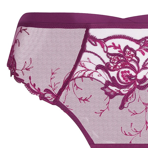 赤い果実の魅力にインスパイアされた鮮やかで明るく深みのある発色が、肌を優しく輝かせ質感に洗練された雰囲気をプラスします。大きなハイビスカスのモチーフが透明感のあるレースの上に官能的に配置され、優雅に彩ります。