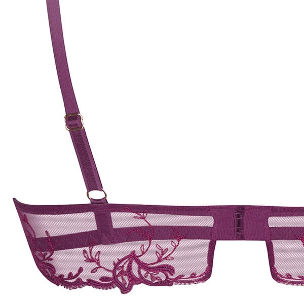 赤い果実の魅力にインスパイアされた鮮やかで明るく深みのある発色が、肌を優しく輝かせ質感に洗練された雰囲気をプラスします。大きなハイビスカスのモチーフが透明感のあるレースの上に官能的に配置され、優雅に彩ります。
