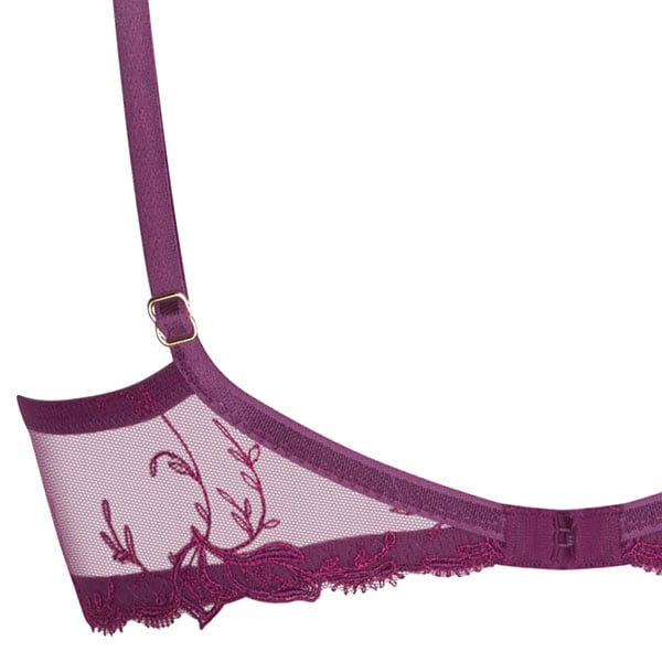 赤い果実の魅力にインスパイアされた鮮やかで明るく深みのある発色が、肌を優しく輝かせ質感に洗練された雰囲気をプラスします。大きなハイビスカスのモチーフが透明感のあるレースの上に官能的に配置され、優雅に彩ります。