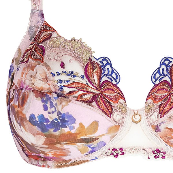 ワイヤー入りのフルカップブラ。脇が3つのパーツで補強されていて、しっかりフィット。優れたサポート力。ベルトは補強のメッシュ裏地付き。画像はDカップ。