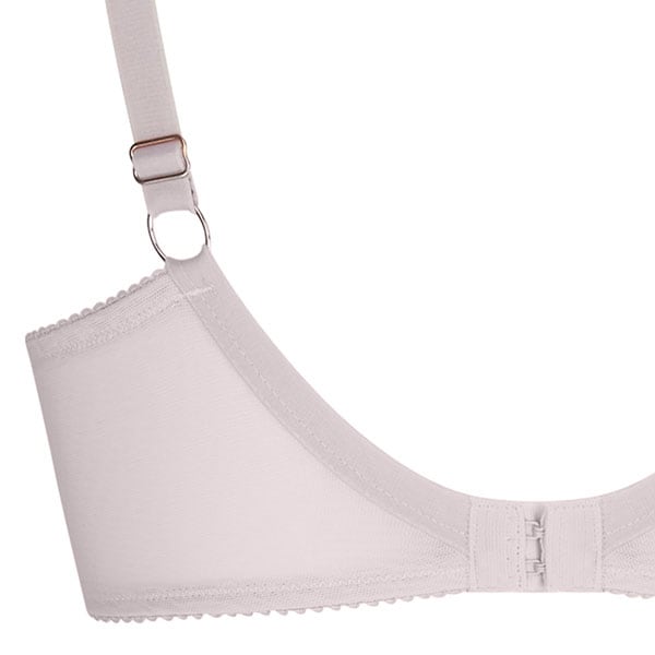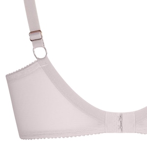 ワイヤー入りのフルカップブラ。脇が3つのパーツで補強されていて、しっかりフィット。優れたサポート力。ベルトは補強のメッシュ裏地付き。画像はDカップ。