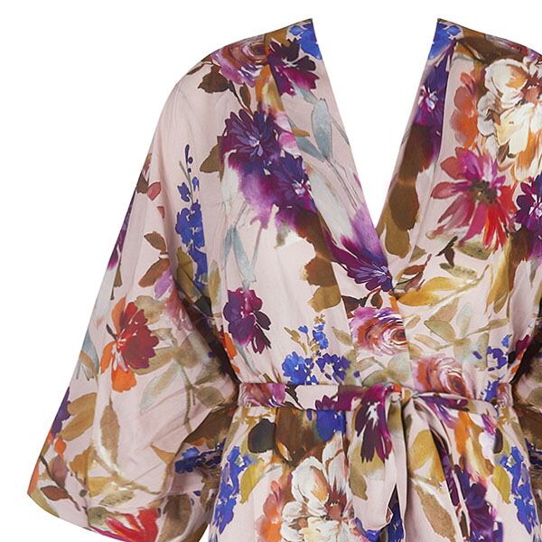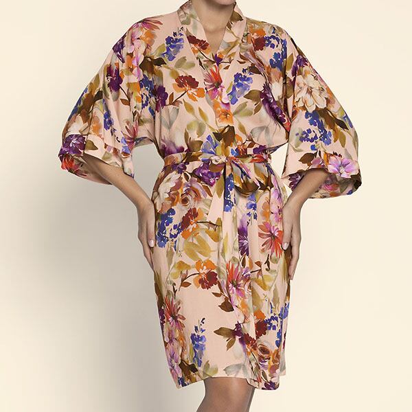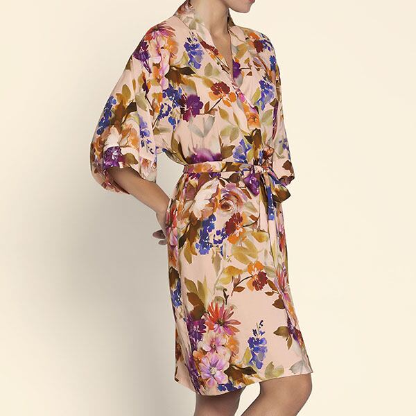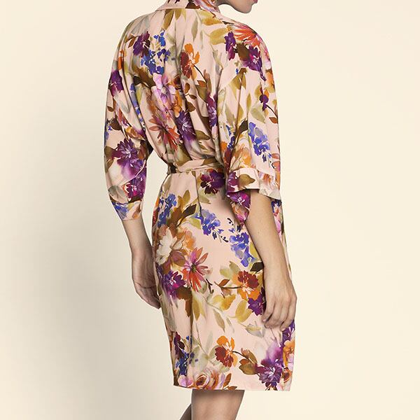 冬の初めの陽光につつまれた庭園の神秘的な美しさへ誘われて。7色の糸からなる花の刺しゅうは、軽やかなルレックス糸の反射で輝き、柔らかな水彩画のようなプリント生地では、シクラメンとパンジーがパウダーピンクの背景に温かく生き生きとした雰囲気を添え、喜びに満ちた祝祭の雰囲気を醸し出します。輝かしい冬にふさわしい、個性的でシックなルックを体現します。