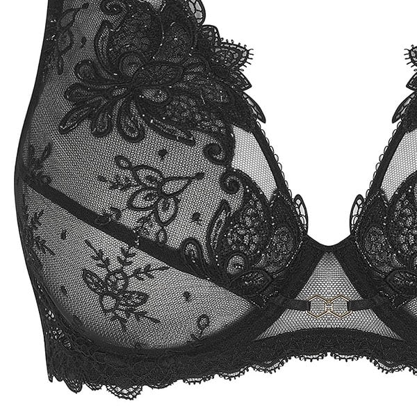 新たな誘惑の芸術、セクシーな魅力。洗練された独創的で華やかなデザインが、 まばゆいばかりの輝きを放ち、私たちを魅了します。ブラックにシルバーのルレックス糸で装飾された曲線と丸みを帯びたイタリア刺しゅうは、コンテンポラリージュエリーの軽やかさを彷彿とさせます。レースにはマイクロスパンコールがあしらわれ、繊細できらめくタッチに目を奪われます。ラグジュアリーなムードで、極めてセクシーなランジェリーをお楽しみください。