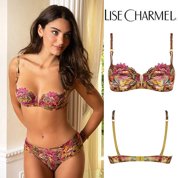ワイルドな旅、喜びの感情に満ちた冒険へ誘われて。トロピカルなプリントを際立たせるのは、7色からなる豪華なイタリアン刺しゅう。ヌードカラーのチュールに施された大きなハイビスカスの花と葉の刺しゅうは肌に優しく溶け込み、チュールプリントのトロピカルなトーンを完璧に引き立てています。プリント柄のレーヨンボイルのランジェリーは洗練された官能性があります。