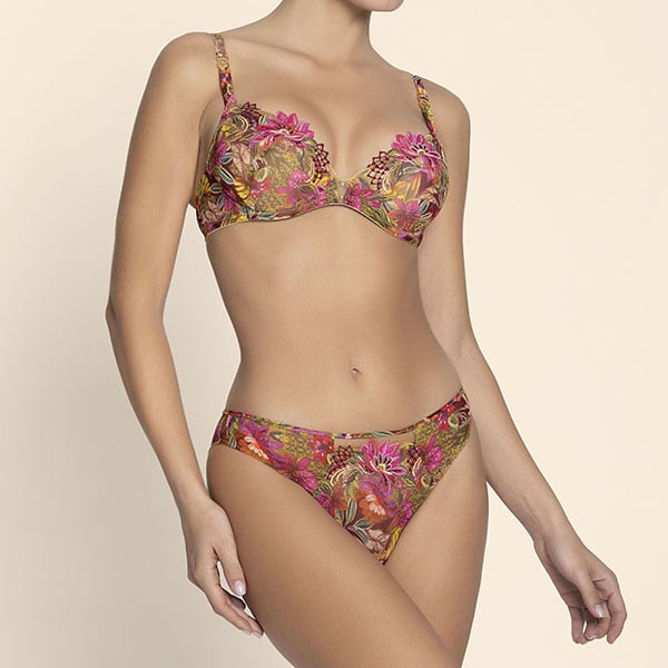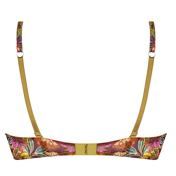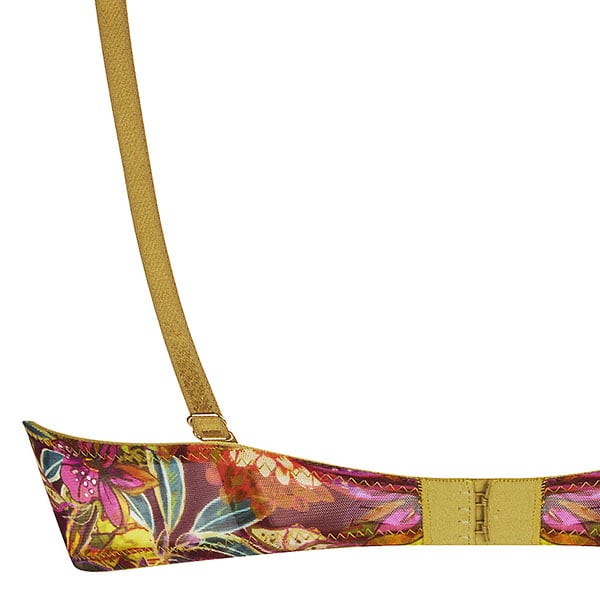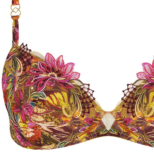 ワイルドな旅、喜びの感情に満ちた冒険へ誘われて。トロピカルなプリントを際立たせるのは、7色からなる豪華なイタリアン刺しゅう。ヌードカラーのチュールに施された大きなハイビスカスの花と葉の刺しゅうは肌に優しく溶け込み、チュールプリントのトロピカルなトーンを完璧に引き立てています。プリント柄のレーヨンボイルのランジェリーは洗練された官能性があります。