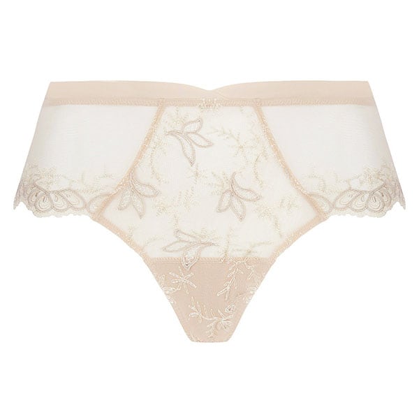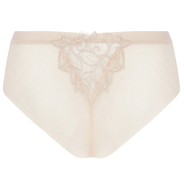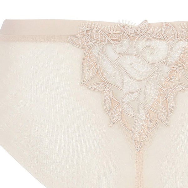 伝統的な職人技とモダンなフォルムを融合させ、柔らかさと心地よさ、そこにロマンティックなスピリットをも体現しています。柔らかなヌードとパールカラーの 2つの異なる糸からなるイタリア製のマルチスレッド刺しゅうが官能的で繊細な美しさをより一層 際立たせ、エレガントで洗練されたシルエットがしなやかな女性の美しさを輝かせます。イタリア製のシルクサテンを用いたランジェリーは、体の動きに寄り添い快適な着心地をもたらします。
