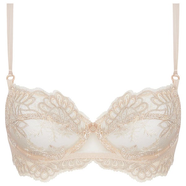 伝統的な職人技とモダンなフォルムを融合させ、柔らかさと心地よさ、そこにロマンティックなスピリットをも体現しています。柔らかなヌードとパールカラーの 2つの異なる糸からなるイタリア製のマルチスレッド刺しゅうが官能的で繊細な美しさをより一層 際立たせ、エレガントで洗練されたシルエットがしなやかな女性の美しさを輝かせます。イタリア製のシルクサテンを用いたランジェリーは、体の動きに寄り添い快適な着心地をもたらします。