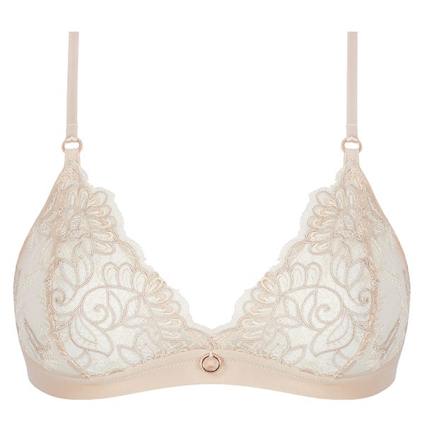 伝統的な職人技とモダンなフォルムを融合させ、柔らかさと心地よさ、そこにロマンティックなスピリットをも体現しています。柔らかなヌードとパールカラーの 2つの異なる糸からなるイタリア製のマルチスレッド刺しゅうが官能的で繊細な美しさをより一層 際立たせ、エレガントで洗練されたシルエットがしなやかな女性の美しさを輝かせます。イタリア製のシルクサテンを用いたランジェリーは、体の動きに寄り添い快適な着心地をもたらします。