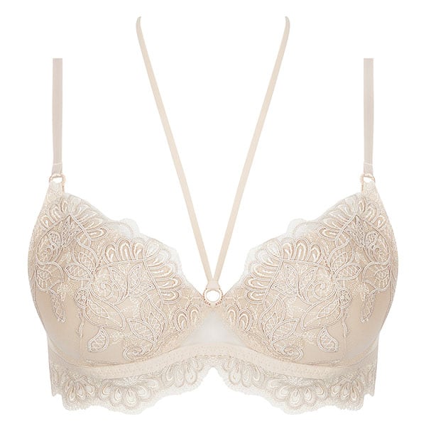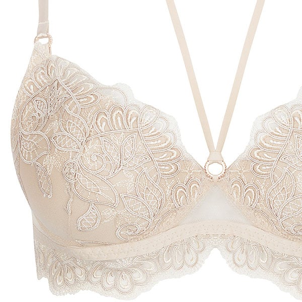 伝統的な職人技とモダンなフォルムを融合させ、柔らかさと心地よさ、そこにロマンティックなスピリットをも体現しています。柔らかなヌードとパールカラーの 2つの異なる糸からなるイタリア製のマルチスレッド刺しゅうが官能的で繊細な美しさをより一層 際立たせ、エレガントで洗練されたシルエットがしなやかな女性の美しさを輝かせます。イタリア製のシルクサテンを用いたランジェリーは、体の動きに寄り添い快適な着心地をもたらします。