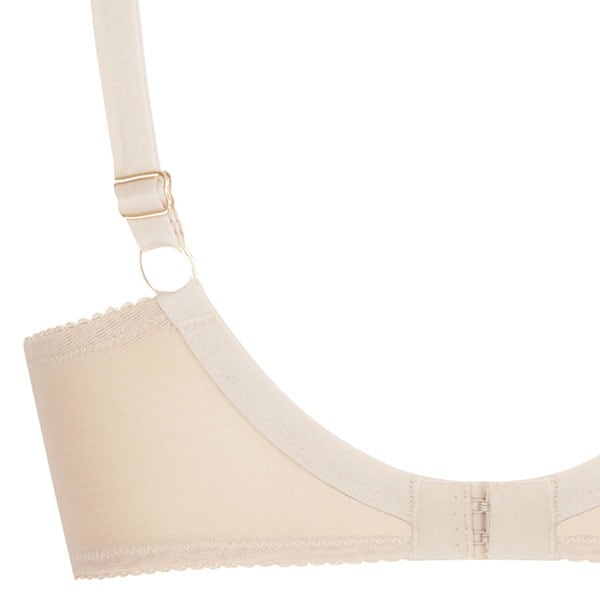 ワイヤー入りのフルカップブラ。脇が3つのパーツで補強されていて、より安定感が増しています。ベルトは補強のメッシュ裏地付き。画像はDカップ。