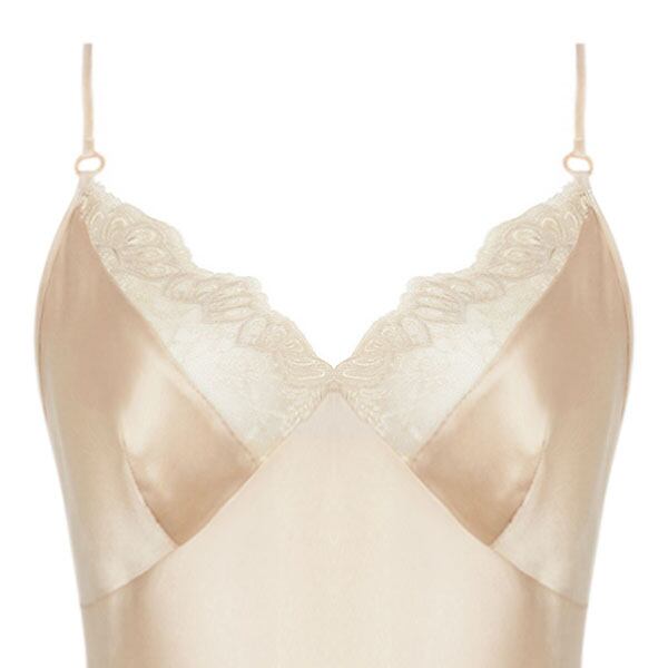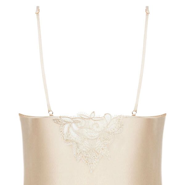 伝統的な職人技とモダンなフォルムを融合させ、柔らかさと心地よさ、そこにロマンティックなスピリットをも体現しています。柔らかなヌードとパールカラーの 2つの異なる糸からなるイタリア製のマルチスレッド刺しゅうが官能的で繊細な美しさをより一層 際立たせ、エレガントで洗練されたシルエットがしなやかな女性の美しさを輝かせます。イタリア製のシルクサテンを用いたランジェリーは、体の動きに寄り添い快適な着心地をもたらします。