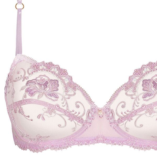 まるでジュエリーのように洗練された刺しゅうの融合。独創的で希少、他に類を見ないデザインで多くの女性を魅了しています。パウダーのようなベースの上に4種類の異なるピンクのきらめく糸を用いた贅沢な刺しゅう。 魅惑的な花々や繊細な渦巻き模様が調和し、織り交ぜた模様と刺しゅうされたパールの冠が、 その美しさをさらに引き立てます。