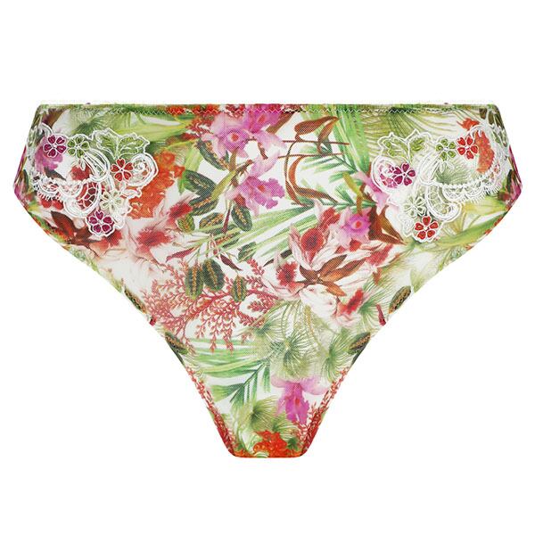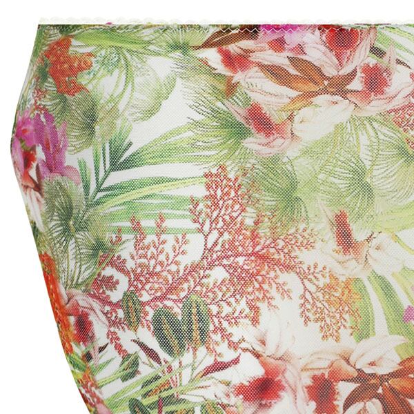 私たちが誘われるのは、魅惑的な香りの蘭が咲き誇る、豊かな自然が息づく南の海。パールの軽やかなベースに喜びに満ちた色彩の豊かさを合わせて、他に類を見ないエレガンスを表現。夏の光に包まれたトロピカルな風景のプリントチュールに、6色からなる繊細なイタリア刺しゅうの組み合わせ。きらめく糸で刺しゅうされた葉や蘭がさりげない輝きを添え、葉の曲線がリズミカルな流れを描き、プリントの透明感が優しい官能性を呼び起こします。官能的で繊細なスタイルで、夏の花の詩情を余すところなく表現しています。