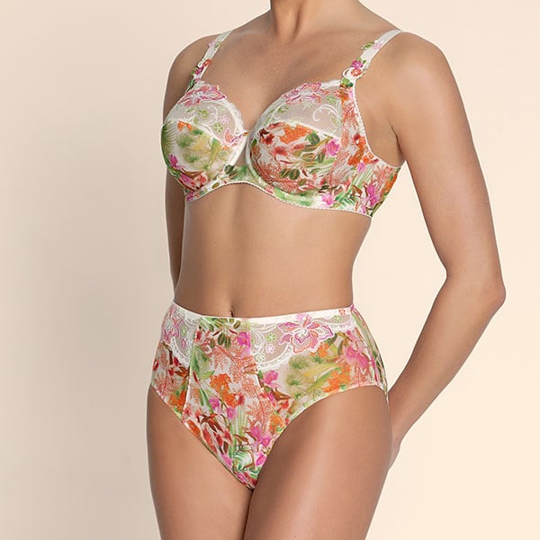 私たちが誘われるのは、魅惑的な香りの蘭が咲き誇る、豊かな自然が息づく南の海。パールの軽やかなベースに喜びに満ちた色彩の豊かさを合わせて、他に類を見ないエレガンスを表現。夏の光に包まれたトロピカルな風景のプリントチュールに、6色からなる繊細なイタリア刺しゅうの組み合わせ。きらめく糸で刺しゅうされた葉や蘭がさりげない輝きを添え、葉の曲線がリズミカルな流れを描き、プリントの透明感が優しい官能性を呼び起こします。官能的で繊細なスタイルで、夏の花の詩情を余すところなく表現しています。
