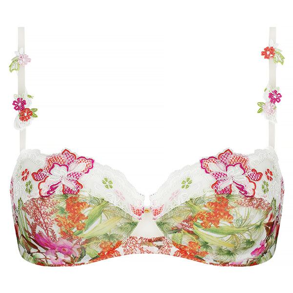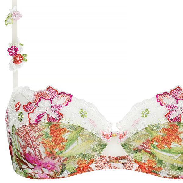 私たちが誘われるのは、魅惑的な香りの蘭が咲き誇る、豊かな自然が息づく南の海。パールの軽やかなベースに喜びに満ちた色彩の豊かさを合わせて、他に類を見ないエレガンスを表現。夏の光に包まれたトロピカルな風景のプリントチュールに、6色からなる繊細なイタリア刺しゅうの組み合わせ。きらめく糸で刺しゅうされた葉や蘭がさりげない輝きを添え、葉の曲線がリズミカルな流れを描き、プリントの透明感が優しい官能性を呼び起こします。官能的で繊細なスタイルで、夏の花の詩情を余すところなく表現しています。