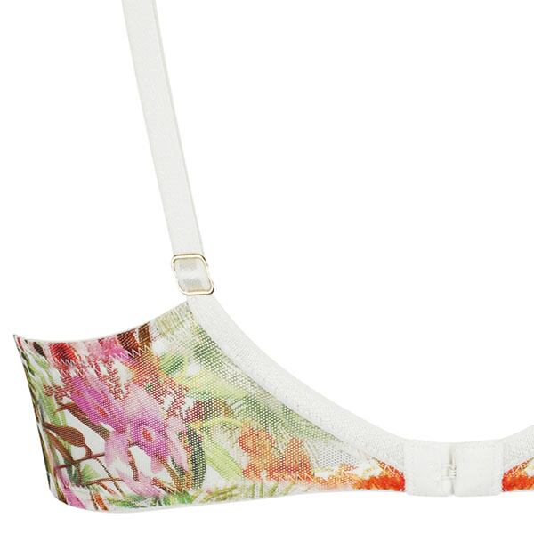 私たちが誘われるのは、魅惑的な香りの蘭が咲き誇る、豊かな自然が息づく南の海。パールの軽やかなベースに喜びに満ちた色彩の豊かさを合わせて、他に類を見ないエレガンスを表現。夏の光に包まれたトロピカルな風景のプリントチュールに、6色からなる繊細なイタリア刺しゅうの組み合わせ。きらめく糸で刺しゅうされた葉や蘭がさりげない輝きを添え、葉の曲線がリズミカルな流れを描き、プリントの透明感が優しい官能性を呼び起こします。官能的で繊細なスタイルで、夏の花の詩情を余すところなく表現しています。