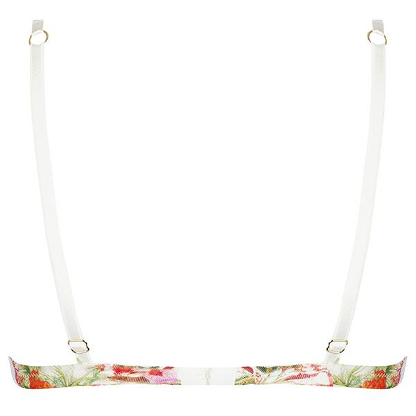 私たちが誘われるのは、魅惑的な香りの蘭が咲き誇る、豊かな自然が息づく南の海。パールの軽やかなベースに喜びに満ちた色彩の豊かさを合わせて、他に類を見ないエレガンスを表現。夏の光に包まれたトロピカルな風景のプリントチュールに、6色からなる繊細なイタリア刺しゅうの組み合わせ。きらめく糸で刺しゅうされた葉や蘭がさりげない輝きを添え、葉の曲線がリズミカルな流れを描き、プリントの透明感が優しい官能性を呼び起こします。官能的で繊細なスタイルで、夏の花の詩情を余すところなく表現しています。