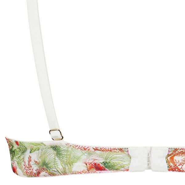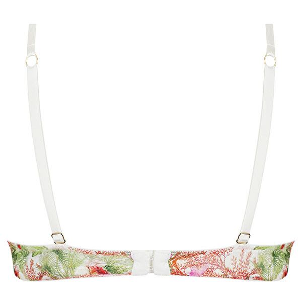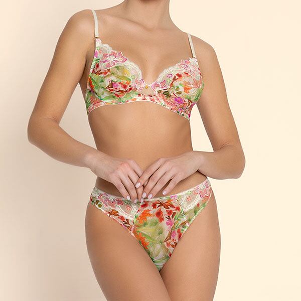 私たちが誘われるのは、魅惑的な香りの蘭が咲き誇る、豊かな自然が息づく南の海。パールの軽やかなベースに喜びに満ちた色彩の豊かさを合わせて、他に類を見ないエレガンスを表現。夏の光に包まれたトロピカルな風景のプリントチュールに、6色からなる繊細なイタリア刺しゅうの組み合わせ。きらめく糸で刺しゅうされた葉や蘭がさりげない輝きを添え、葉の曲線がリズミカルな流れを描き、プリントの透明感が優しい官能性を呼び起こします。官能的で繊細なスタイルで、夏の花の詩情を余すところなく表現しています。