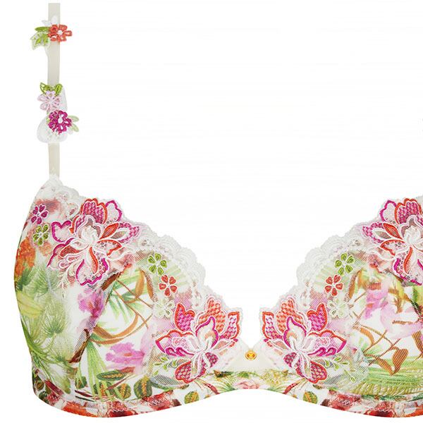 私たちが誘われるのは、魅惑的な香りの蘭が咲き誇る、豊かな自然が息づく南の海。パールの軽やかなベースに喜びに満ちた色彩の豊かさを合わせて、他に類を見ないエレガンスを表現。夏の光に包まれたトロピカルな風景のプリントチュールに、6色からなる繊細なイタリア刺しゅうの組み合わせ。きらめく糸で刺しゅうされた葉や蘭がさりげない輝きを添え、葉の曲線がリズミカルな流れを描き、プリントの透明感が優しい官能性を呼び起こします。官能的で繊細なスタイルで、夏の花の詩情を余すところなく表現しています。