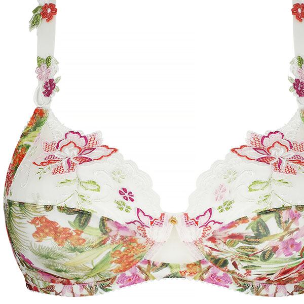私たちが誘われるのは、魅惑的な香りの蘭が咲き誇る、豊かな自然が息づく南の海。パールの軽やかなベースに喜びに満ちた色彩の豊かさを合わせて、他に類を見ないエレガンスを表現。夏の光に包まれたトロピカルな風景のプリントチュールに、6色からなる繊細なイタリア刺しゅうの組み合わせ。きらめく糸で刺しゅうされた葉や蘭がさりげない輝きを添え、葉の曲線がリズミカルな流れを描き、プリントの透明感が優しい官能性を呼び起こします。官能的で繊細なスタイルで、夏の花の詩情を余すところなく表現しています。