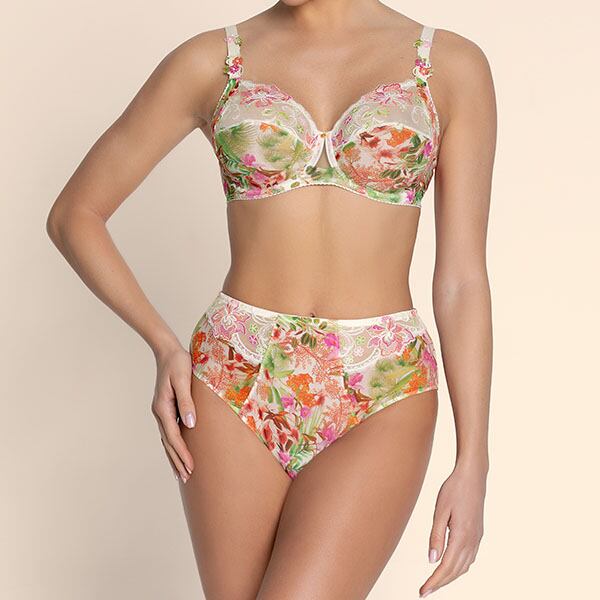 私たちが誘われるのは、魅惑的な香りの蘭が咲き誇る、豊かな自然が息づく南の海。パールの軽やかなベースに喜びに満ちた色彩の豊かさを合わせて、他に類を見ないエレガンスを表現。夏の光に包まれたトロピカルな風景のプリントチュールに、6色からなる繊細なイタリア刺しゅうの組み合わせ。きらめく糸で刺しゅうされた葉や蘭がさりげない輝きを添え、葉の曲線がリズミカルな流れを描き、プリントの透明感が優しい官能性を呼び起こします。官能的で繊細なスタイルで、夏の花の詩情を余すところなく表現しています。