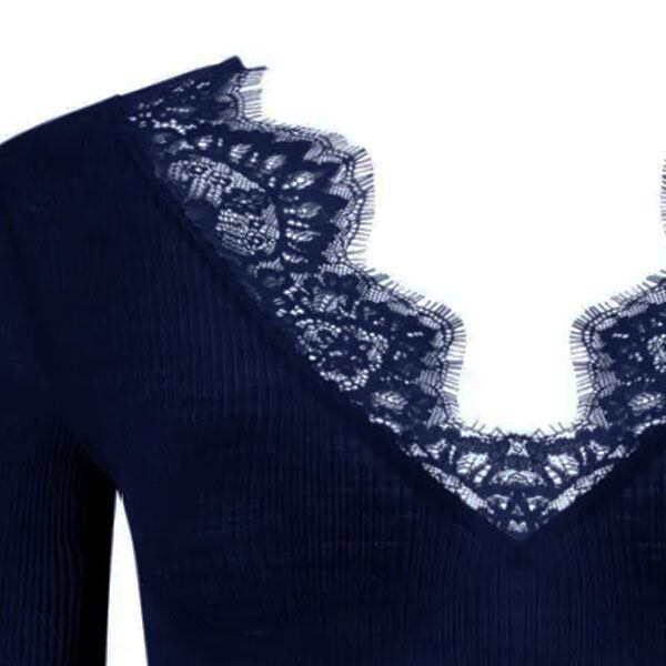 長袖ニット。ネックラインに繊細なレースが配され、女性らしさを演出します。