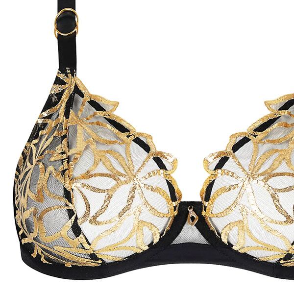 冬のラグジュアリー、ゴールド。エレガンスと華やかさの中間に位置するこのラインは、ブラックのチュールにゴールドのラミネート加工した刺しゅうが華麗な輝きを放ち、軽やかなリボンのように刺しゅうされた花々はまるでタトゥーのように肌の上に浮かび上がる。このラミネートの新しい技術は、ルレックス糸を使用するよりも素晴らしい柔らかさと快適さをもたらします。大胆で生き生きとした、華やかでモダンな女性を讃える華やかなクリエーション、最もワイルドなパーティーのためのラインです。