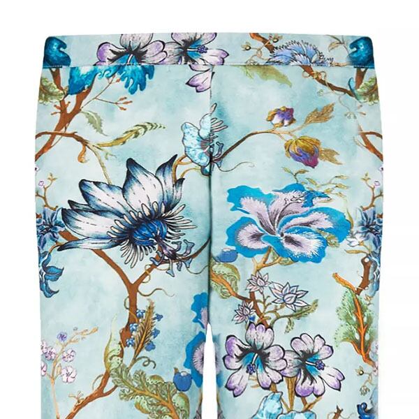 パンタロン。ビスコース・サテン。非常に滑らかで軽く、大変ソフトな手触りです。プリント柄はインクジェット技法で施されており、非常に高精細で高品質な色彩で、オリジナルデザインが見事に表現されています。ウエスト背面は伸縮性があり、着脱しやすくなっています。