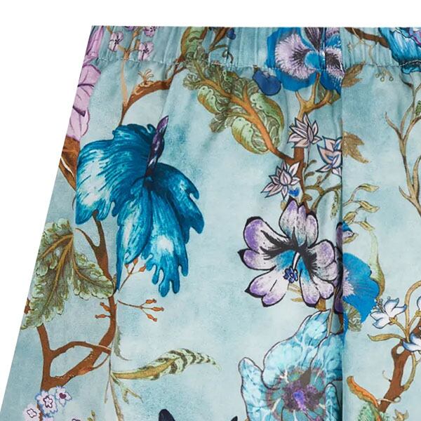 フレアショーツ。ビスコース・サテン。非常に滑らかで軽く、大変ソフトな手触りです。プリント柄はインクジェット技法で施されており、非常に高精細で高品質な色彩で、オリジナルデザインが見事に表現されています。ウエスト背面は伸縮性があり、着脱しやすくなっています。