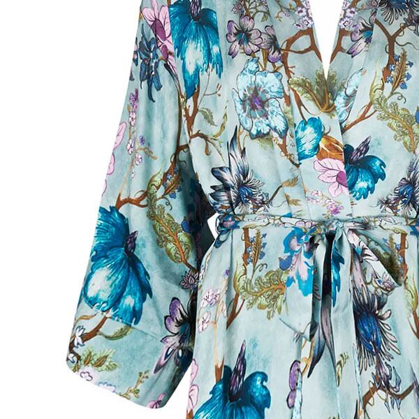 ガウン。ビスコース・サテン。非常に滑らかで軽く、大変ソフトな手触りです。プリント柄はインクジェット技法で施されており、非常に高精細で高品質な色彩で、オリジナルデザインが見事に表現されています。着物スタイル。ベルトループ付き。